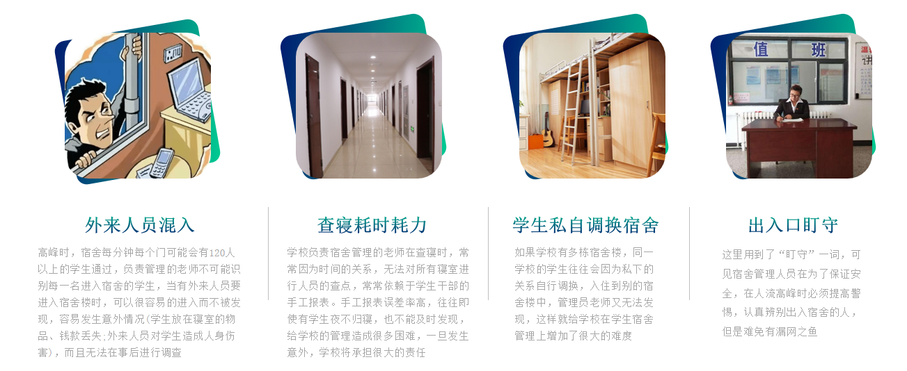 在學(xué)校的日常生活中,宿舍是一個(gè)重要的生活場景,宿舍區(qū)域是學(xué)生日常逗留時(shí)間最長的區(qū)域,也是社會屬性形成最快的區(qū)域,承擔(dān)著重要的育人職責(zé)。學(xué)生安全管理工作中,宿舍的安全也是重要的組成部分,由于宿舍為高頻的生活場景,出入事件時(shí)刻都在發(fā)生,如何隔絕外來人員的出入是宿舍安全的很重要部分。最近幾年,媒體頻繁曝光學(xué)生夜不歸宿引起的安全事故,學(xué)生的歸寢、查寢工作是學(xué)生安全管理工作的重要組成部分。綜上所述,宿舍場景在學(xué)校中承擔(dān)重要職責(zé),宿舍的出入管理尤為重要,而此工作概括來說分為兩部分:不該進(jìn)的不能進(jìn)、該回來的要回來。
