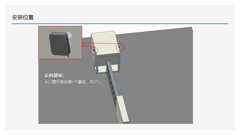 定向智慧網(wǎng)關(guān)一般使用在校門(mén)、小區(qū)門(mén)口,其安裝時(shí)需要根據(jù)大門(mén)實(shí)際尺寸來(lái)規(guī)劃基站安裝位置和角度。