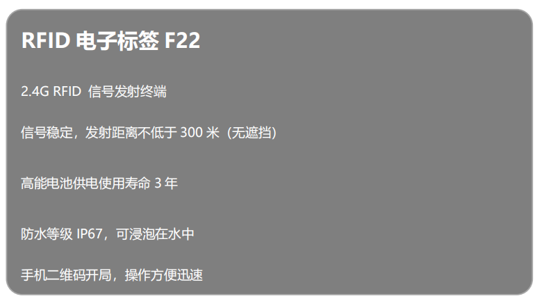 RFID電子標(biāo)簽F22是任聯(lián)自主研發(fā)的2.4G RFID無線信號發(fā)射終端,經(jīng)過無線感應(yīng)基站時,基站感應(yīng)到RFID電子標(biāo)簽并上傳到大數(shù)據(jù)后臺,通過基站的位置刻畫出電子標(biāo)簽運動的軌跡。F22采用成熟方案,功耗低,成本低,性價比高,目前廣泛用于成熟應(yīng)用在智慧城市電動車防盜解決方案、智慧小區(qū)、資產(chǎn)管理等基于位置定位的解決方案中。