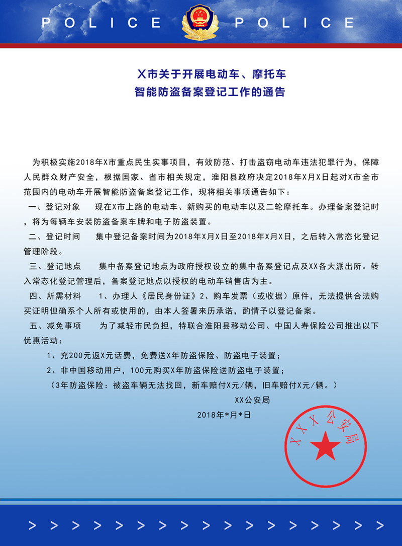 3、二輪電動車的備案登記不只是上牌,同時對電動車的科學管理、基于電動車的社會治安防控體系建設都是有巨大的作用,所以在通告發(fā)布單位上一定要聯(lián)合當?shù)氐木C治辦。