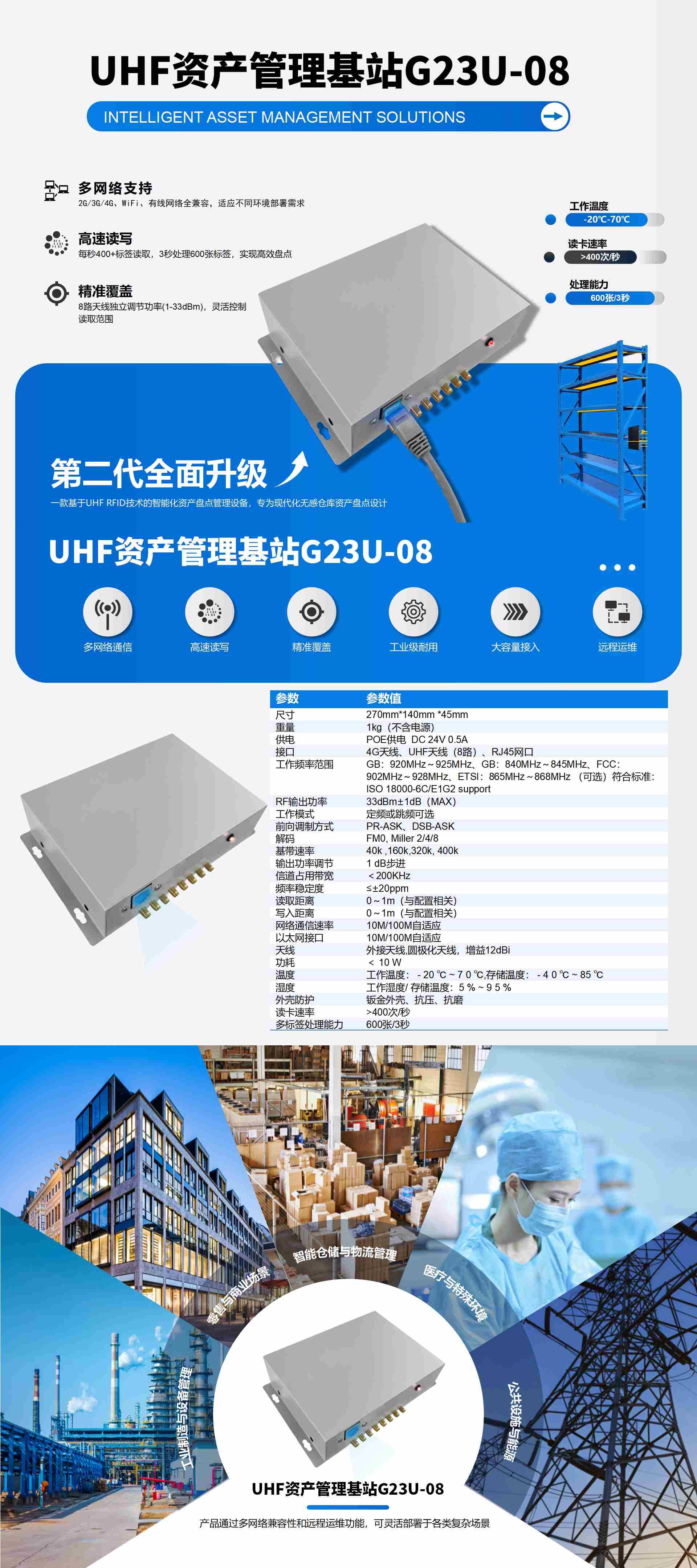該基站采用工業(yè)級設(shè)計,采用鈑金外殼防護,抗壓抗磨損。外接8路射頻天線,一臺基站可覆蓋多個貨架減少主機用量,設(shè)備每秒可讀取400個以上標(biāo)簽數(shù)據(jù),滿足大規(guī)模資產(chǎn)盤點的精準(zhǔn)管理需求。設(shè)備支持4G/有線網(wǎng)絡(luò)多種通信方式,數(shù)據(jù)可實時上傳至管理平臺,幫助企業(yè)實時了解資產(chǎn)狀態(tài),實現(xiàn)資產(chǎn)溯源、精確盤點和定位管理。