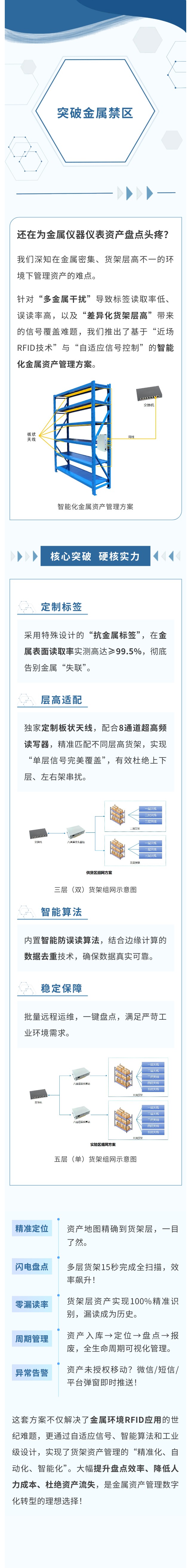 我們深知在金屬密集、貨架層高不一的環(huán)境下管理資產(chǎn)的難點(diǎn)。 針對(duì)“多金屬干擾”導(dǎo)致標(biāo)簽讀取率低、誤讀率高,以及“差異化貨架層高”帶來的信號(hào)覆蓋難題,我們推出了基于“近場(chǎng)RFID技術(shù)”與“自適應(yīng)信號(hào)控制”的智能化金屬資產(chǎn)管理方案。